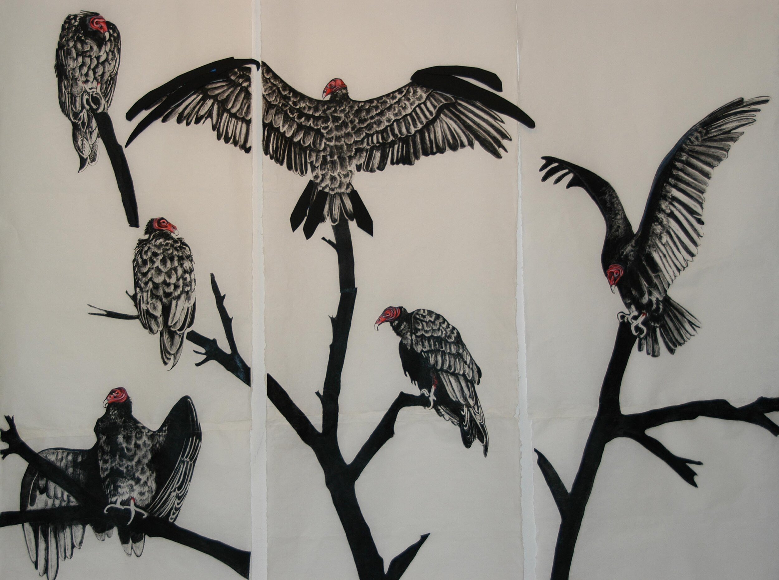 The Web of Life Installation was incubating in my mind for years. It began with wanting to create banners of tree prints on rice paper. A colleague in Taiwan sent the rice paper to me. My husband, Frank, and I carried this paper, printing ink and a 6 foot ladder, on hikes into the Gila National Forest, the Grand Teton National Park, and on kayak trips along lakes, to record tree patterns I saw over a two-year period. Working on this project I began to notice trees each have their own characteristic bark patterns, which are affected by exposure to insects, animals, fire, snow, rain, lightning, sun and wind. It was not until I started hanging the tree prints in my studio that the Stele Forest of Xi’an, China came to mind. There, rooms and gardens full of dark looming stone tablets, covered with calligraphy, memorializing the dead and the living in China, dwarfed me. The limited space in my studio was beginning to have that feeling, as I worked on 20, 8foot tree prints. My tree prints too, are memorials to the living and the dead. I encased the prints in encaustic medium to preserve them and made them translucent, which illuminated the patterns, ridges, and grooves from years of growth and wear on each tree. The venue of Turkey Vultures worked its way into my installation with a mountain lion kill of a doe in our arroyo.